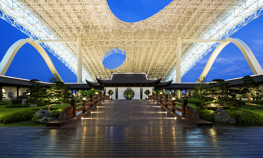 G20峰會(huì)主會(huì)場(chǎng)空中花園施工內(nèi)容包括屋頂花園景觀、仿古建筑、水體景觀積水循環(huán)系統(tǒng)等。屋頂花園整體以“西湖明珠從天降、龍飛鳳舞到錢塘”為設(shè)計(jì)理念,以典型的江南園林風(fēng)格為范本,吸收了中國(guó)古典園林中多種造景元素,詩(shī)意地闡釋了江南園林的獨(dú)特韻味。水景、植栽、石景和建筑相互輝映,傳統(tǒng)江南園林的工匠精神與哲學(xué)思考深蘊(yùn)其中,展現(xiàn)細(xì)致入微且非常玄妙的獨(dú)特美感。是國(guó)內(nèi)功能齊全,中國(guó)特色濃郁,生態(tài)環(huán)境優(yōu)美的屋頂花園。