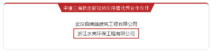 11月22日,中建三局抗擊新冠肺炎疫情表彰大會暨先進(jìn)事跡報(bào)告會在武漢召開,中建三局黨委書記、董事長陳文健攜先進(jìn)個人和干部職工代表共計(jì)4200余人在主會場和252個視頻分會場參加會議。太陽成集團(tuán)tyc環(huán)境旗下全資子公司浙江水美環(huán)保工程有限公司(以下統(tǒng)稱“太陽成集團(tuán)tyc環(huán)境”)獲評中建三局抗擊新冠肺炎疫情“優(yōu)秀合作伙伴”稱號。